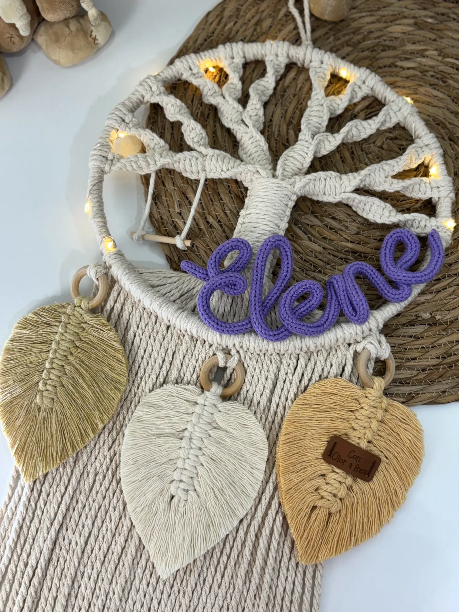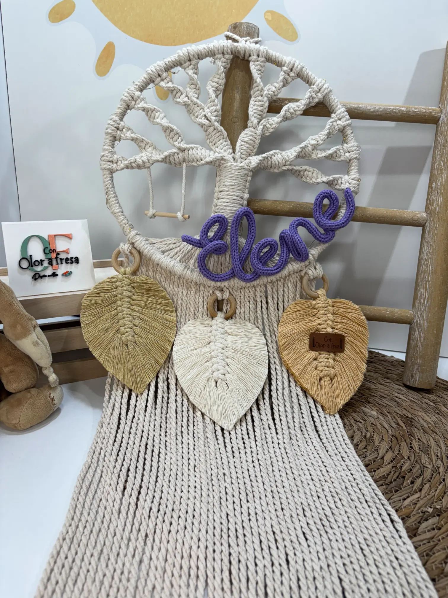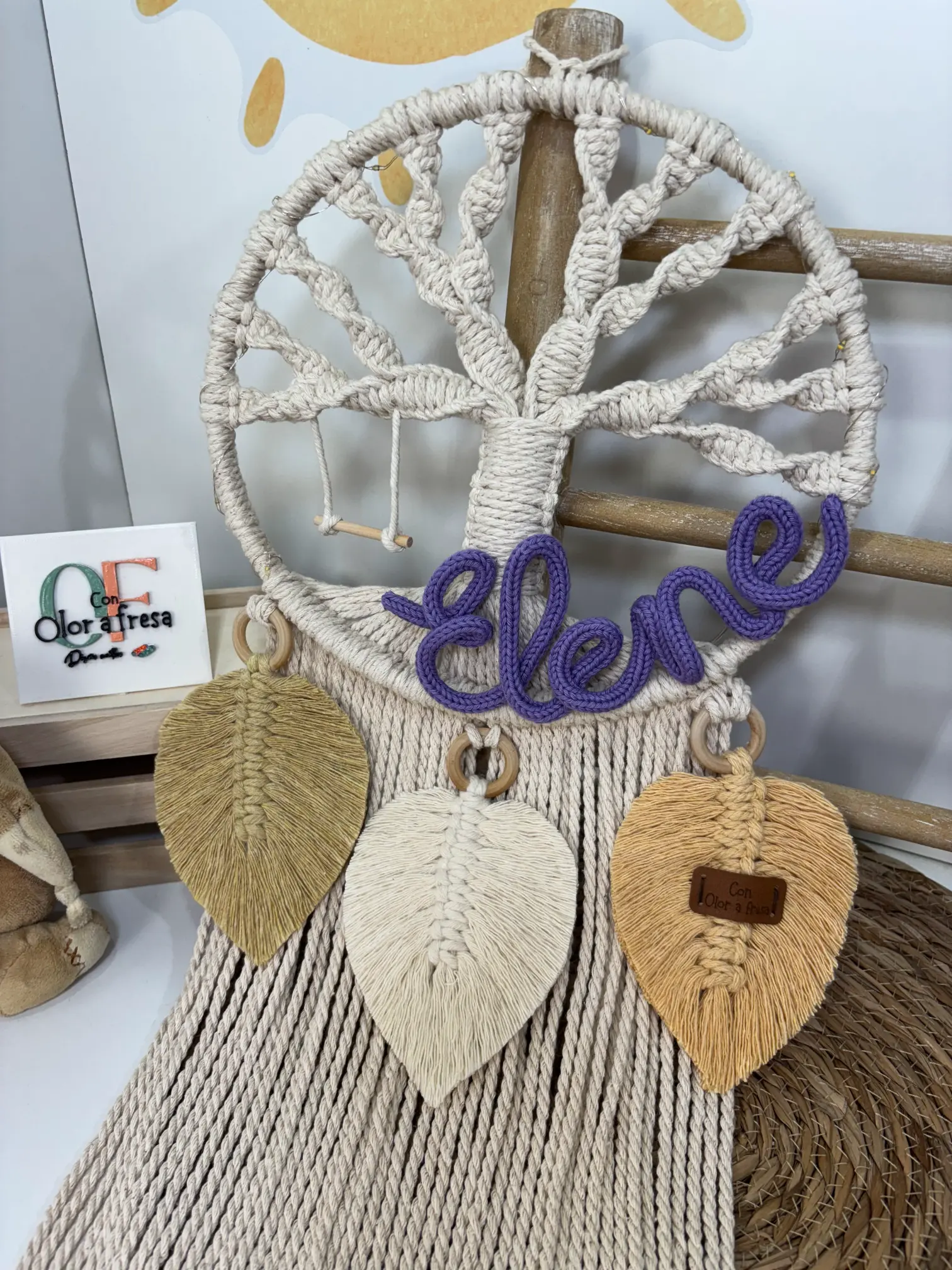 Incluye un pequeño columpio de madera que cuelga de una de las ramas del árbol y tres hojas grandes hechas de macramé.