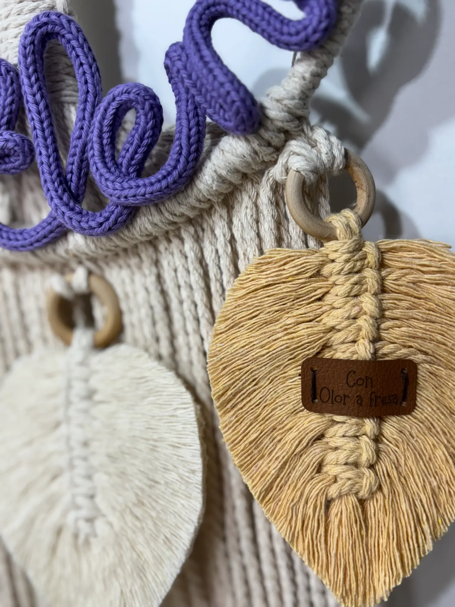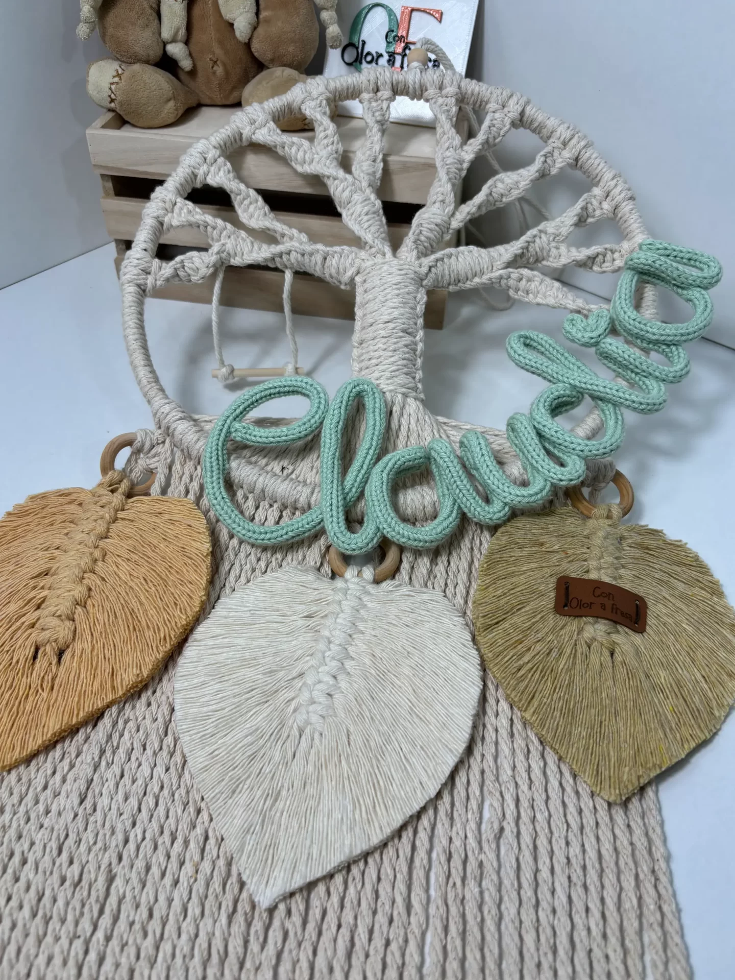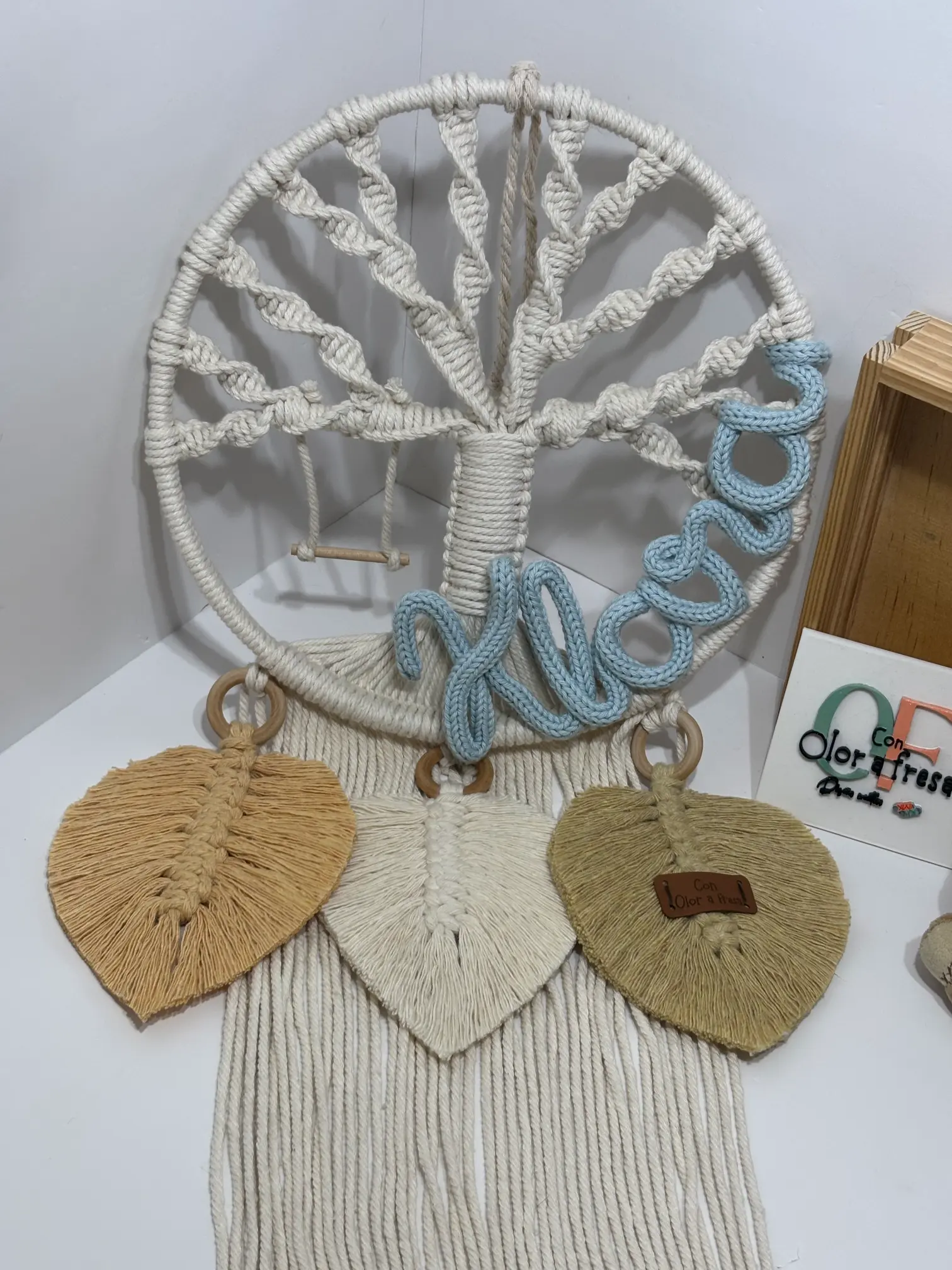 Incluye un pequeño columpio de madera que cuelga de una de las ramas del árbol y tres hojas grandes hechas de macramé.