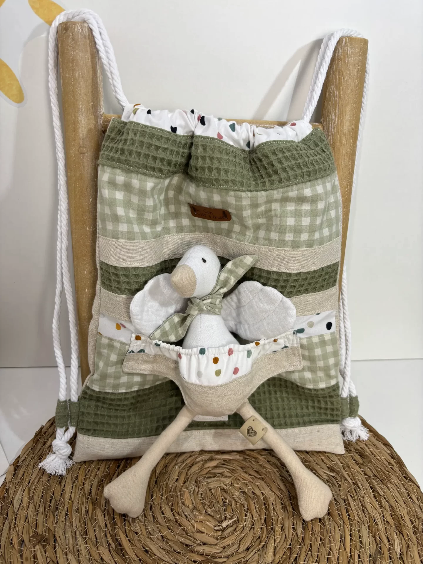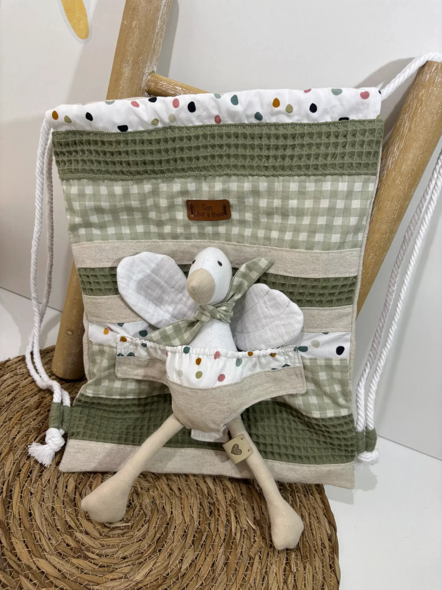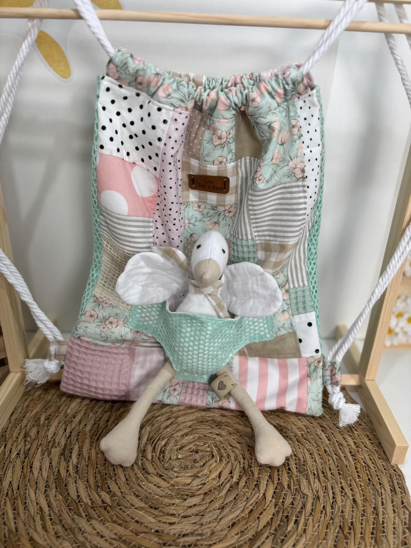 Mochila de cuerdas muy divertida confeccionada con una braguita en la parte delantera para introducir cualquier muñeco de mis tres colecciones.