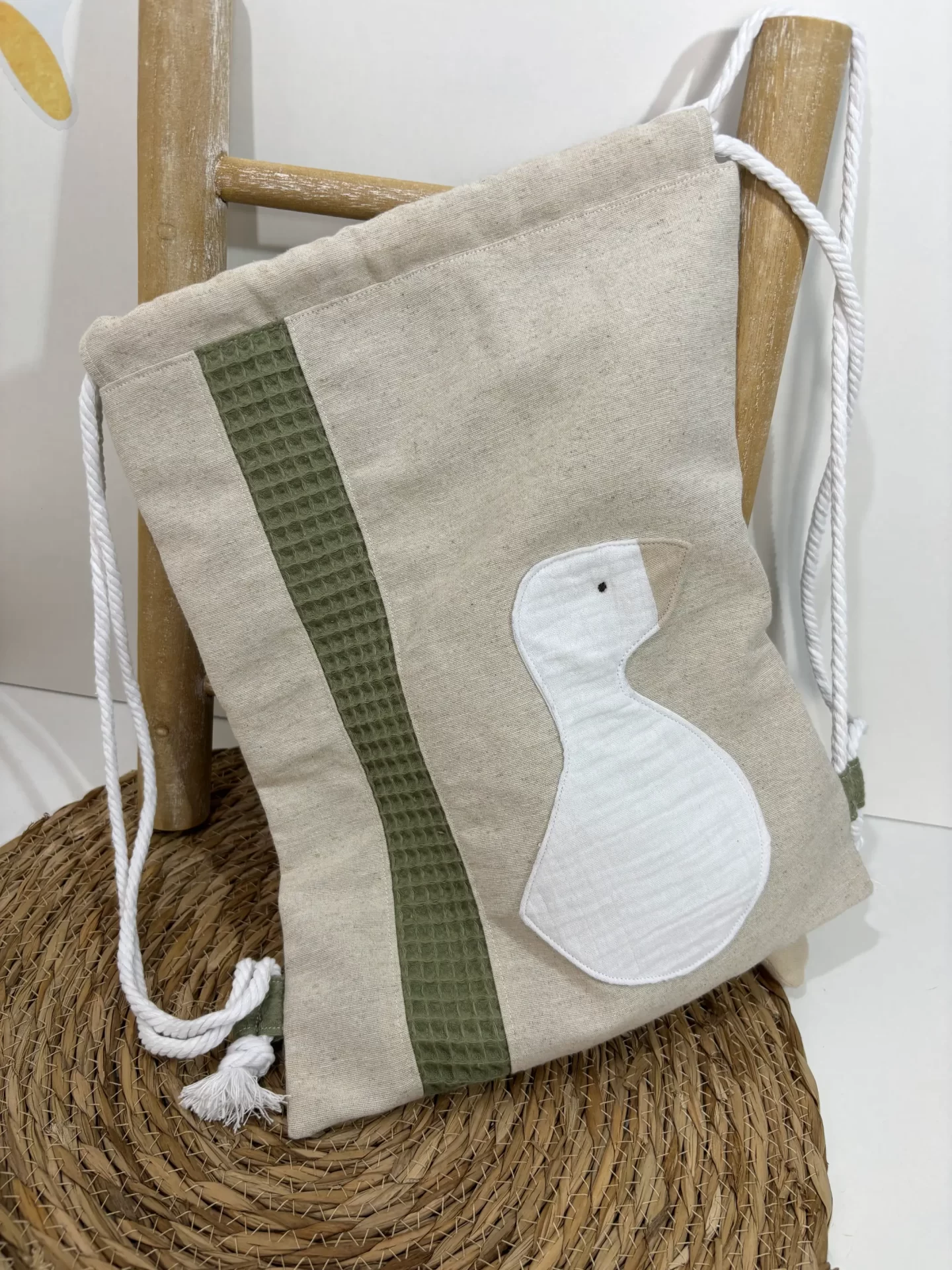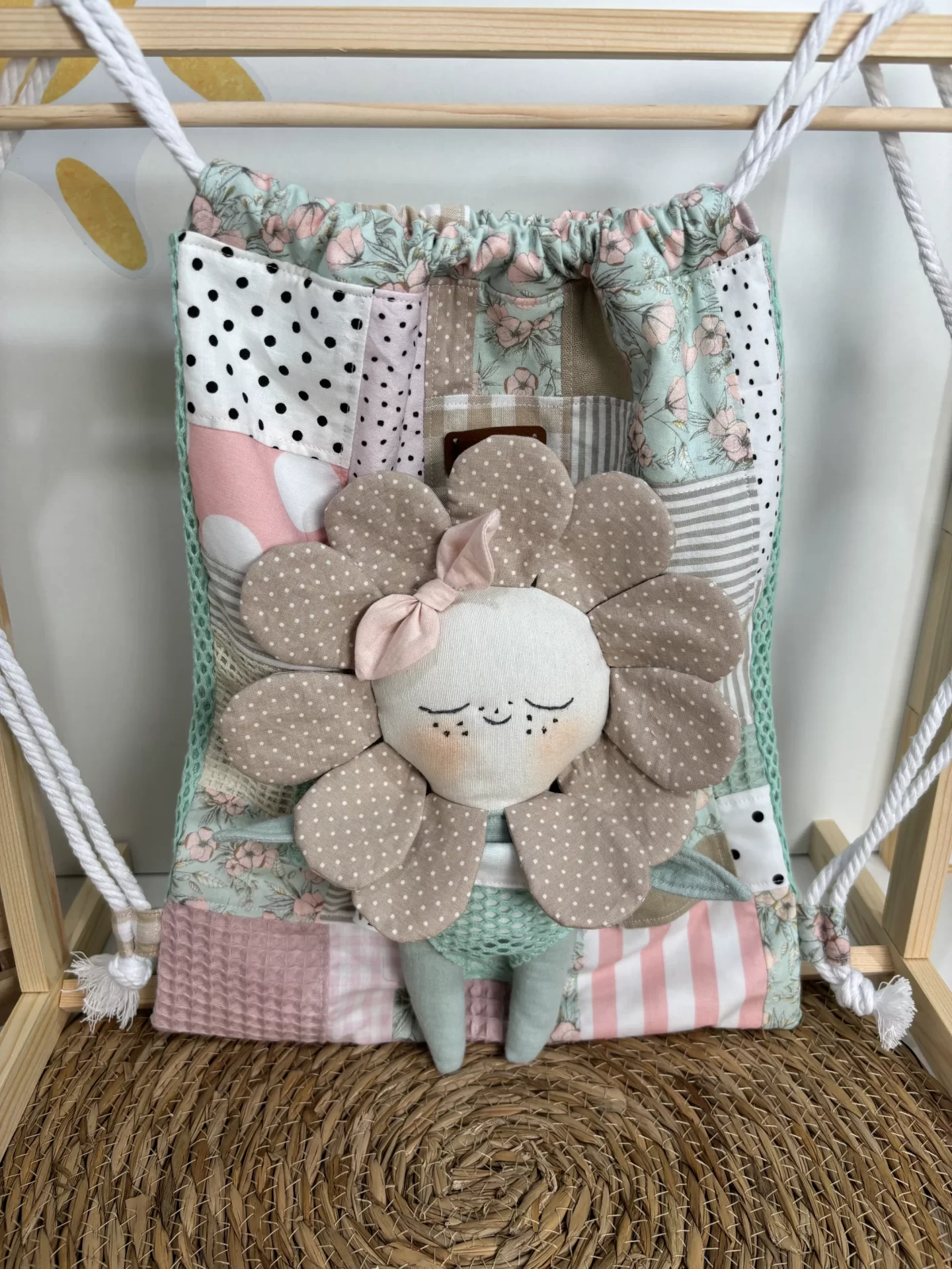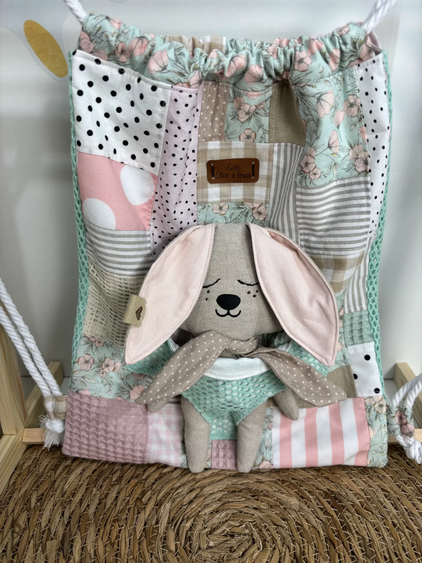 Mochila de cuerdas muy divertida confeccionada con una braguita en la parte delantera para introducir cualquier muñeco de mis tres colecciones.